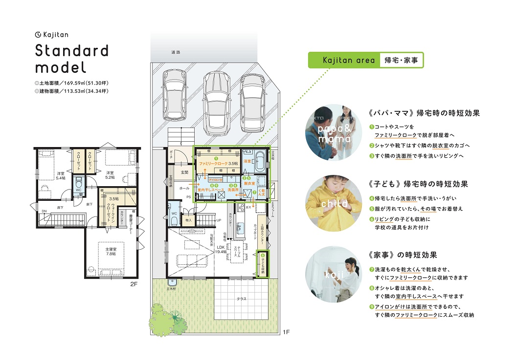 設計コンセプト『Kajitan』(カジタン) 営業 記事掲載日:2019年07月12日 共働き・子育て世帯に 家事の時間を短縮して 家族の時間を効率化する 設計コンセプト『Kajitan』イメージモデル